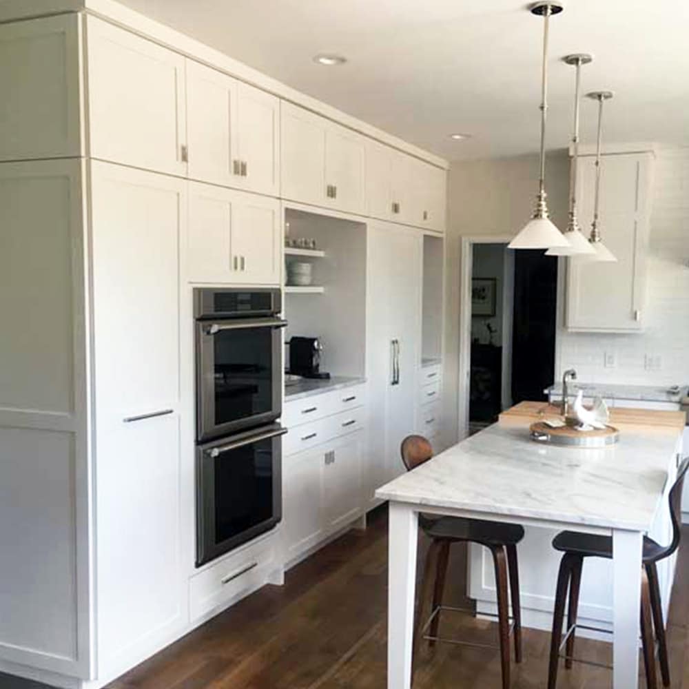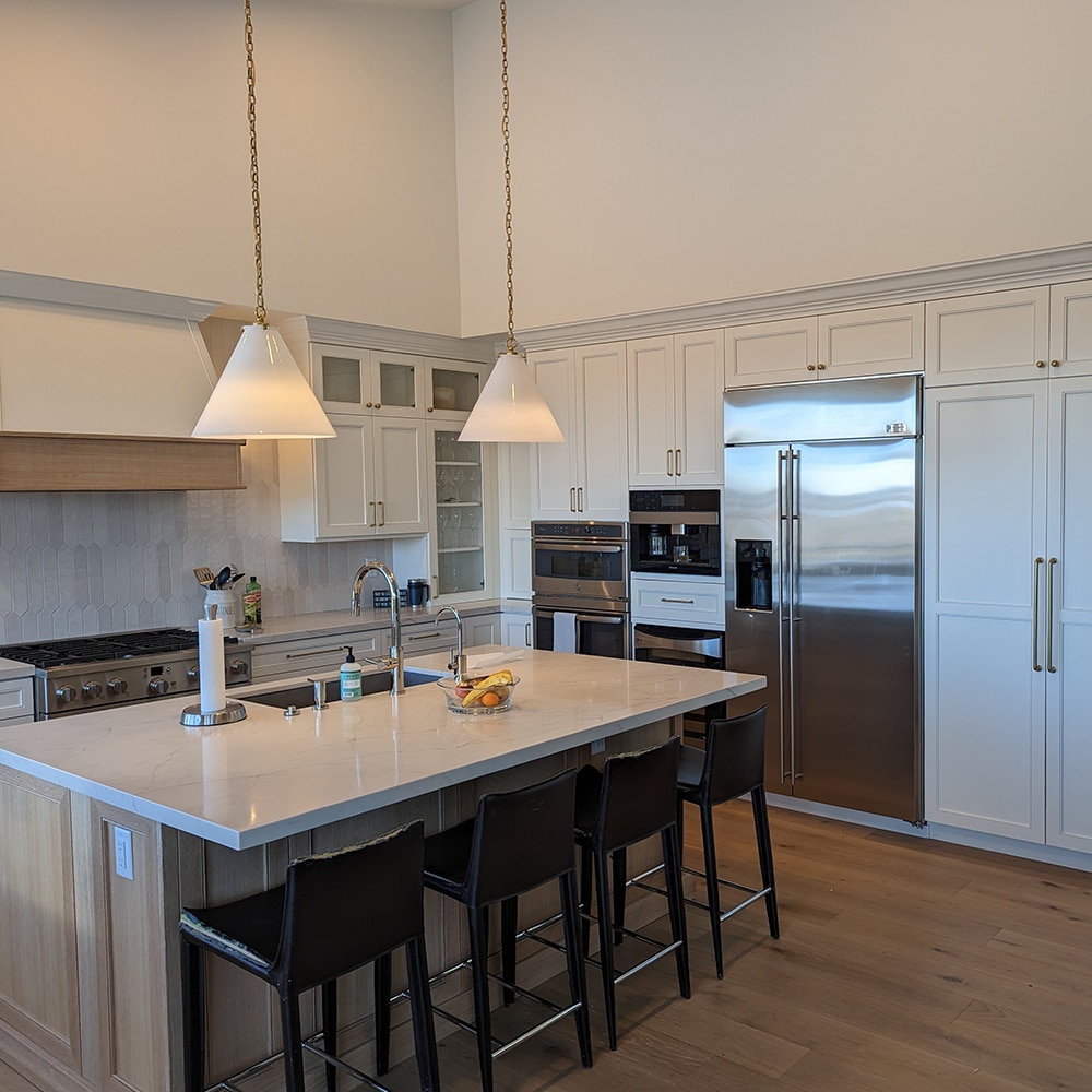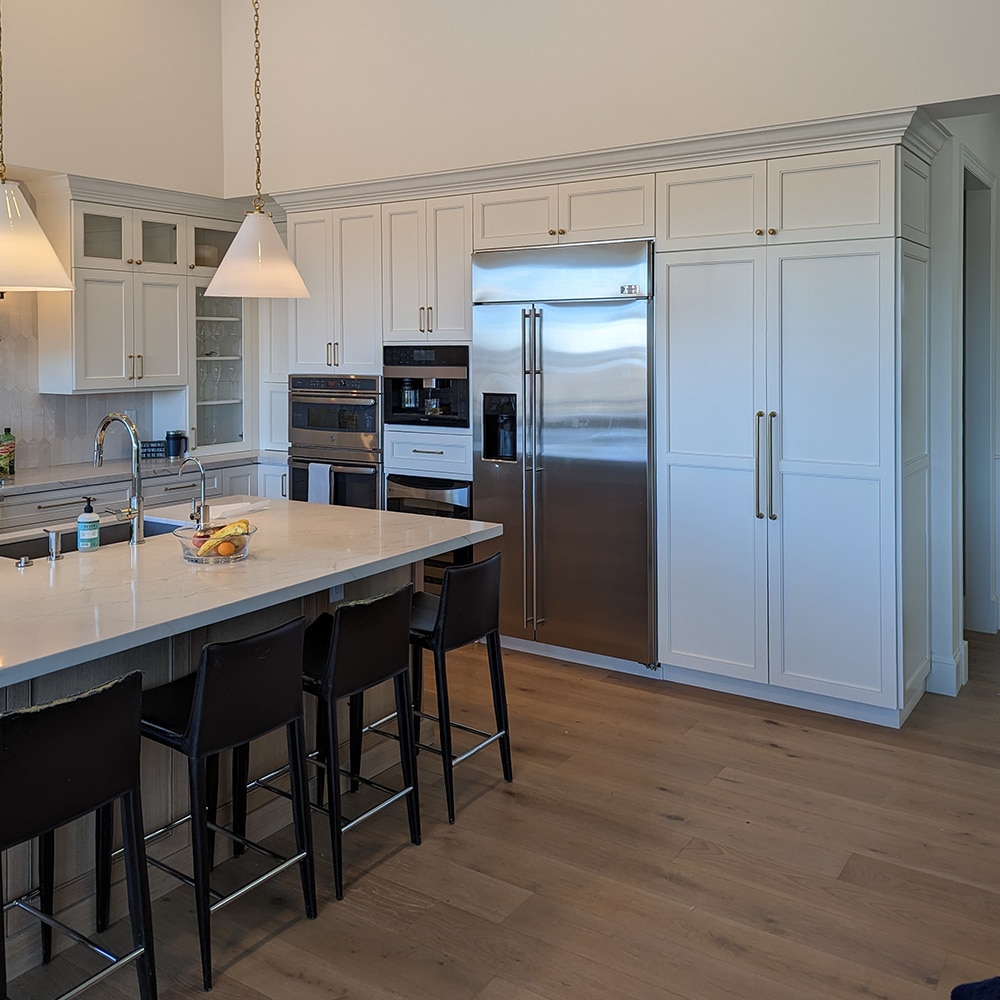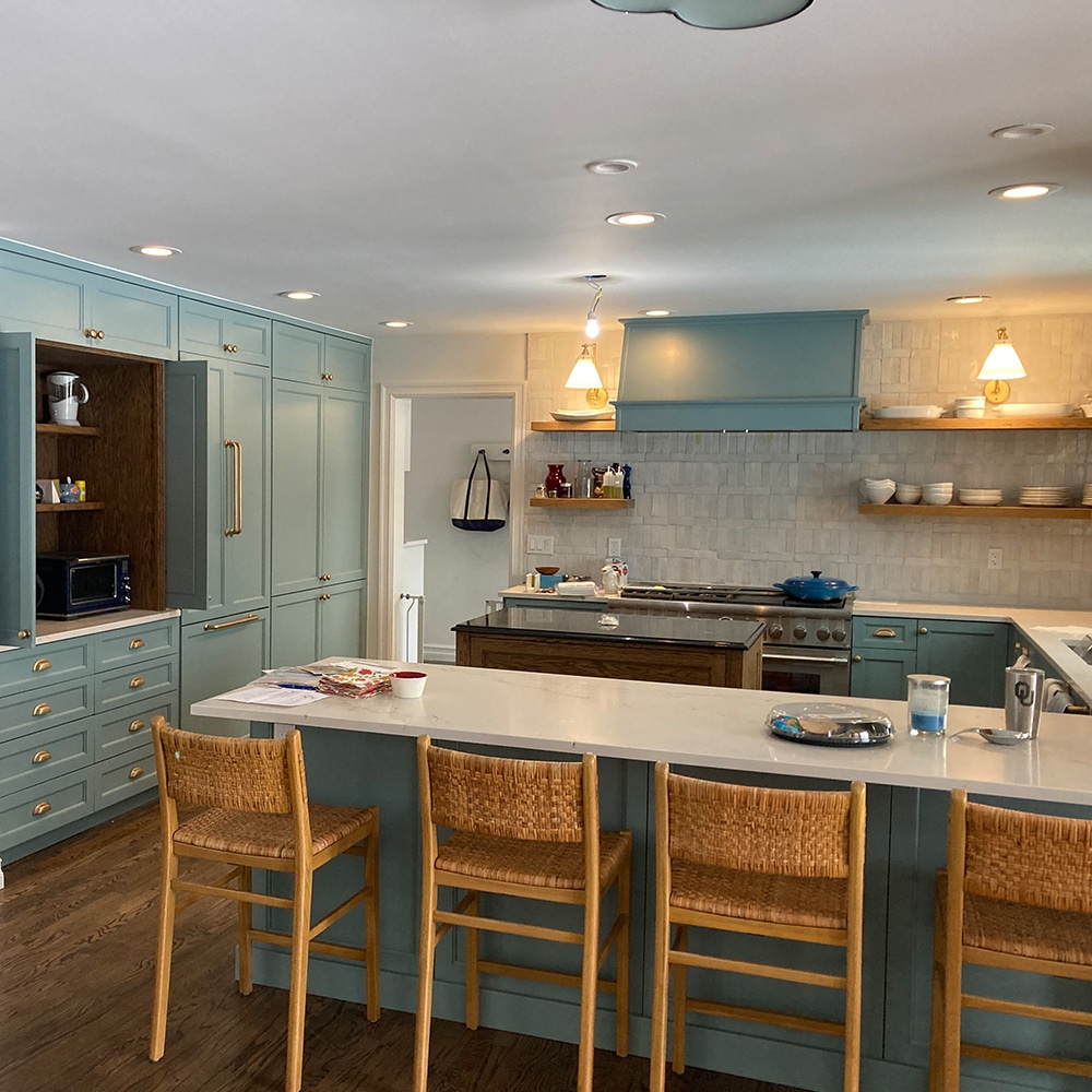 Complete new kitchen and master bathroom. Painted cabinets are White Dove and Island is Alder with a Baltic Birch stain using a product brand called OSMO. We helped with the final design and completed all installations.