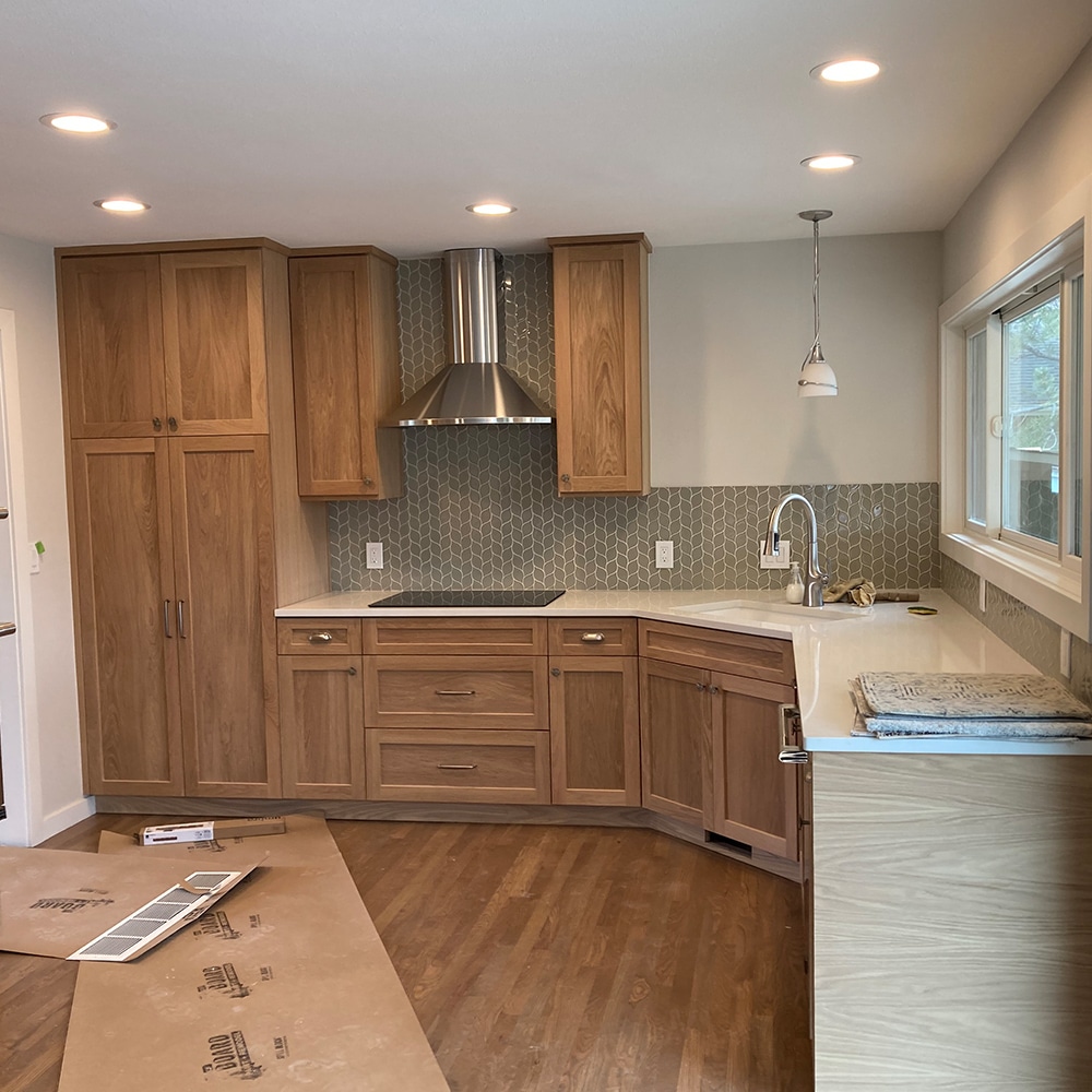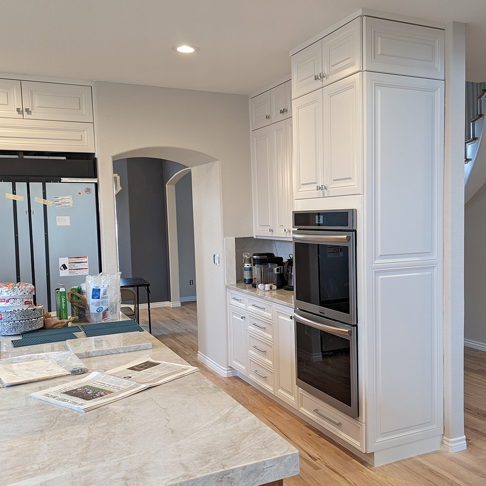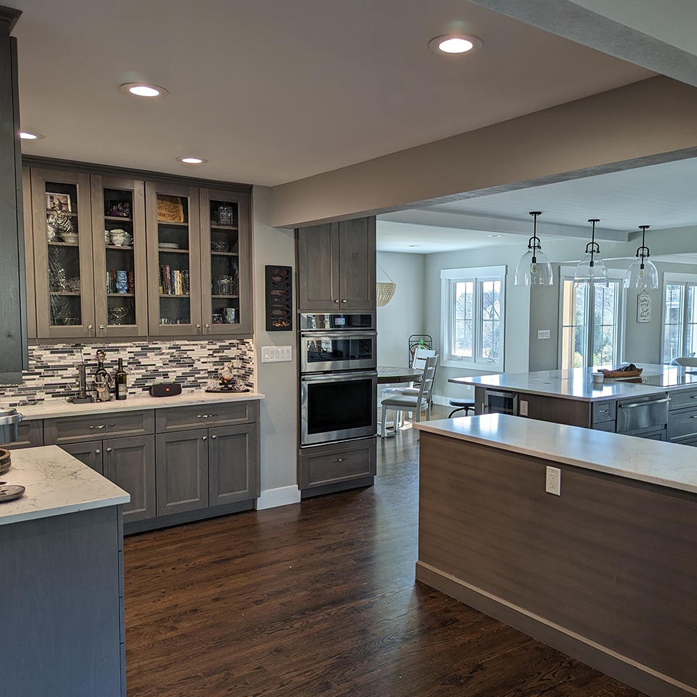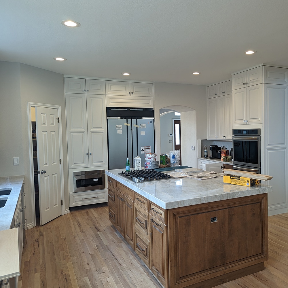 This project was part of a whole home renovation and addition done by Arnold Construction (Arnoldbuilt.com). This was a tricky project. We modified the existing kitchen and added to it with matching finishes. We had to remove existing cabinets, help with the new design, build new matching cabinets, add the new coffee bar area and sidebar cabinets, enlarge the island, and build that large pullout.